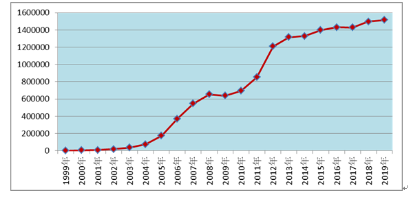 2019年全國(guó)藥品不良反應(yīng)監(jiān)測(cè)網(wǎng)絡(luò)收到《藥品不良反應(yīng)/事件報(bào)告表》151.4萬(wàn)份。1999年至2019年,全國(guó)藥品不良反應(yīng)監(jiān)測(cè)網(wǎng)絡(luò)累計(jì)收到《藥品不良反應(yīng)/事件報(bào)告表》1,519萬(wàn)份(圖1)。