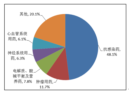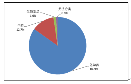 按照藥品類(lèi)別統(tǒng)計(jì),化學(xué)藥品占86.6%,中藥占12.6%,生物制品占0.8%?;瘜W(xué)藥品排名居前的藥品類(lèi)別是抗感染藥、心血管系統(tǒng)用藥、腫瘤用藥、神經(jīng)系統(tǒng)用藥、電解質(zhì)、酸堿平衡及營(yíng)養(yǎng)藥;中藥排名居前的藥品類(lèi)別是理血?jiǎng)⒀a(bǔ)益劑、祛濕劑、開(kāi)竅劑、清熱劑。