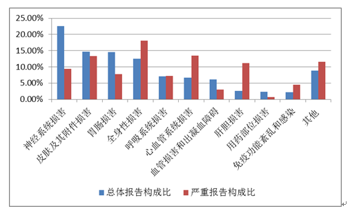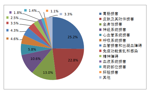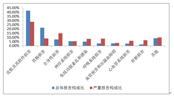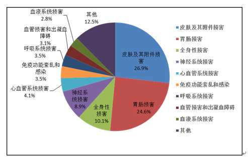 2019年國(guó)家基本藥物化學(xué)藥品和生物制品不良反應(yīng)/事件報(bào)告,按照藥品類(lèi)別統(tǒng)計(jì),報(bào)告數(shù)量排名前5位的分別是抗微生物藥、心血管系統(tǒng)用藥、抗腫瘤藥、激素及影響內(nèi)分泌藥、治療精神障礙藥;累及器官系統(tǒng)排名前5位的是皮膚及其附件損害、胃腸損害、全身性損害、神經(jīng)系統(tǒng)損害以及血液系統(tǒng)損害。