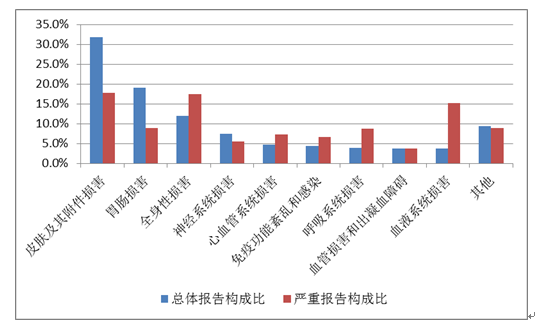 抗感染藥整體藥品不良反應(yīng)/事件報(bào)告中,口服制劑累及器官系統(tǒng)排名前5位的是胃腸損害、皮膚及其附件損害、神經(jīng)系統(tǒng)損害、肝膽損害、全身性損害;注射劑累及器官系統(tǒng)排名前5位是皮膚及其附件損害、胃腸損害、全身性損害、免疫功能紊亂和感染、神經(jīng)系統(tǒng)損害。